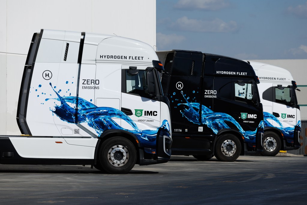 Hydrogen-powered trucks at IMC headquarters in Compton on Oct. 29, 2024. Photo by Carlin Stiehl for CalMatters